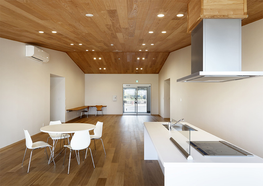 平⾯計画としては、建物に2本の軸線を意識させるシンプルな構成としています。南北の軸線は、南側のロケーション、北側の近隣住戸と建物の連続性をもたせることを意図しており、エントランスから、共有のリビングを介して、ウッドデッキ、さらにその先の⽥園⾵景へとつながる視界の抜けを明快に感知することができます。外部に突き出すように延⻑させた住⼾間の界壁や、南北に向かって折れ下がる勾配天井によりパースペクティブな効果が得られ、⽅向性をより強調させています。また、南北の軸線に直⾏する東⻄の軸線は、各個室への中廊下となっていますが、共有リビングを挟んで東⻄の個室を8室+4室のユニットに分け、軸線を直線的に通すのではなくクランクさせることで、シンプルな空間構成の中わずかなプランニングの操作で空間に変化を与えています。