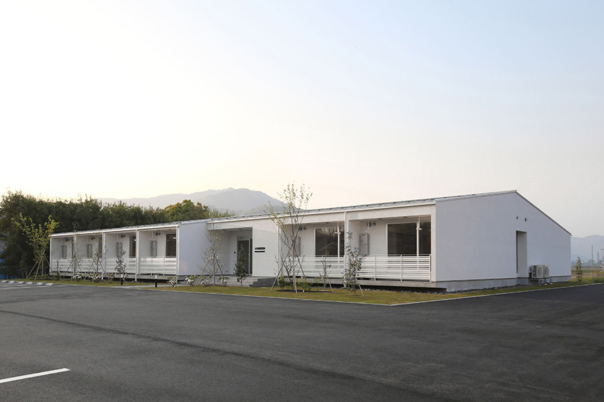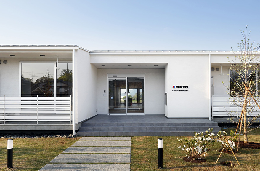 建築主の株式会社技研製作所様は、世界で初めて振動・騒音のない画期的な杭圧入機を開発したスーパーテクノロジー企業で、「圧⼊」をベースとした無公害建設⼯事を世界40カ国以上で推進、普及するリーディングカンパニーです。「インプラント工法」は東日本大震災後にさらに注目され、近年の震災、豪雨被災地の復旧工事や地震津波対策、幅広いインフラ事業に採用されるなど技術革新で社会に貢献されています。数ある工場の一つである関西工場を兵庫県丹波市に置かれており、これまでも社内研修等が継続的に行われてきましたが、近隣に宿泊施設がなく、少し離れた京都府福知山市のビジネスホテル等を研修の際の社員の生活の場とされていました。研修後にビジネスホテルで寝るだけの分断された生活ではなく、主として2~3か月の交替で継続的に行われる新入社員研修や海外からの研修のための宿舎、出張者の生活の場、それぞれの生活の快適性が求められていました。