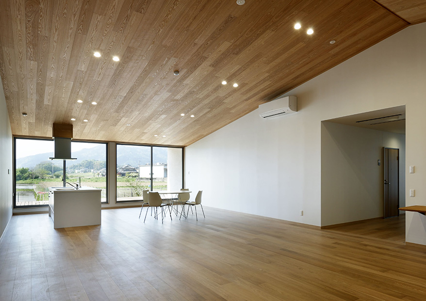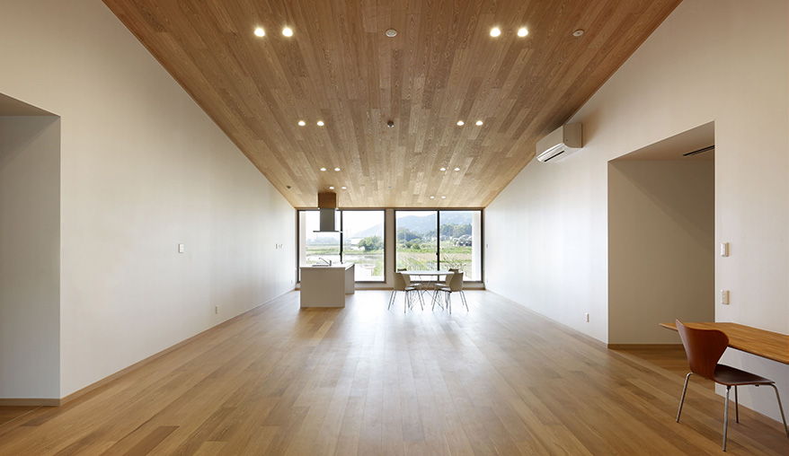 最初にこの敷地を拝見した際に感じたことは、日本の原風景ともいえるようなロケーションを建物内に積極的に取り入れ、周辺環境に溶け込む建物にしたいということでした。360度低い里山の山並みがうかがえ、北側には民家の集落があるものの、南側には建物がなく農地が広がり、東側周囲には江戸時代から伝わる造り酒屋の由緒ある建物が近接し、西側の道路沿いのみ農地転用された中に比較的新しい建物が点在する。昔からほとんど様相が変わらない場所。南側一帯の農地は道路から離れているため農地転用されることはなく、今後開発されることはないであろう。のどかな田園風景の中、そうした場所に唐突に新築の建物が立ち現れると、どうしても周辺環境に対して違和感を与えてしまいます。環境に寄り添う建物として、周囲の里山の山並みを意識し、高さを抑えつつ、緩勾配の山型の形態をした「平屋建て」の建物を提案したいと考えました。