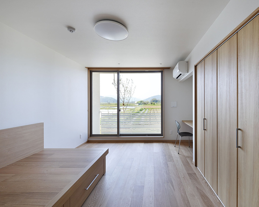 開口部はアルミサッシの規格品ではあるものの、天井いっぱいの高さに配置し、ガラス面を大きく確保。明るく開放的で、窓の外に広がるのどかな田園風景は心を癒してくれます。また見えない部分にも快適性を配慮。住戸間の遮音性に対しては、間柱を千鳥に配置して空隙を設けることで伝達音を緩和し、石膏ボードを重ね貼りした上に、さらにふかし壁を設け、コンセント・スイッチ類等はふかし壁内のみに設け、界壁に穴や切り欠きを一切開けないようにして、住戸間の音を遮断。標準的なワンルーム住戸の構成であるものの、通常のワンルームマンション住戸の1.5倍の34㎡の面積を確保。一般的な低層木造アパートとは違い、遮音性が高く、ゆとりある快適な生活が送れる仕様としています。