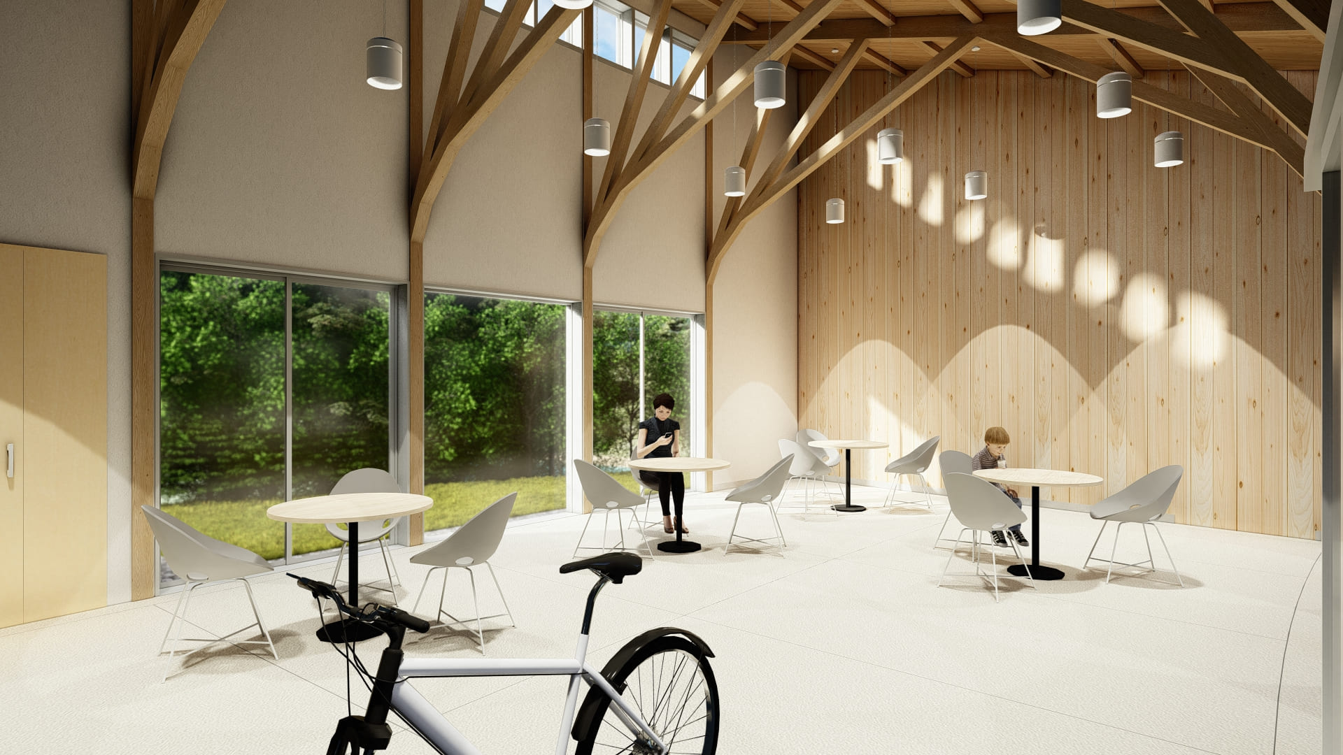 「丹波の夢ビジョン」で示されている「いのち(自然)・ひと(人間)・なりわい(産業)」の3つの「環」を育む公園施設であることに加えて、今回計画されるサイクルステーションが、サイクルツーリズムの推進による地域の活性化の拠点として、『わ(環・和・輪)を育み、広げ、つながりをつくっていく』というコンセプトを建築計画により明確に表現したいと考えました。コンセプトの強度を高めるために核となる幾何学上の中心点を据え、同心円状に園内のケヤキ並木、サクラ並木から連続する並木道の延長に見立てた回廊を設け、それに沿うように各室を空間構成しています。休憩・フリースペースは、樹形をイメージした木の架構があらわしになった開放的な空間で、下地や天井の仕上に用いた構造用合板も含めて、兵庫県産材のスギ、ヒノキの材で構成しています。